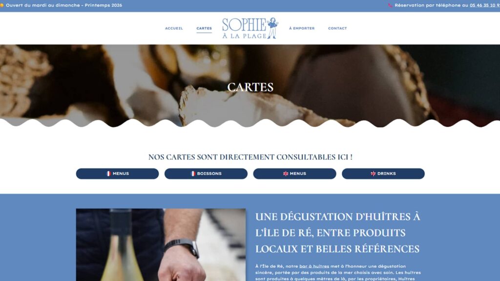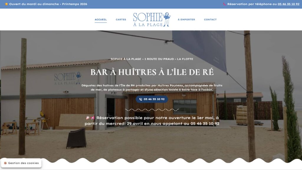 Le projet Sophie à la Plage consistait à créer un site vitrine WordPress pour présenter une cabane de dégustation d’huîtres située à La Flotte, sur l’Île de Ré. L’objectif était de traduire en ligne l’univers du lieu : une expérience simple, maritime et conviviale, portée par des huîtres produites localement par Huîtres Pouneau.